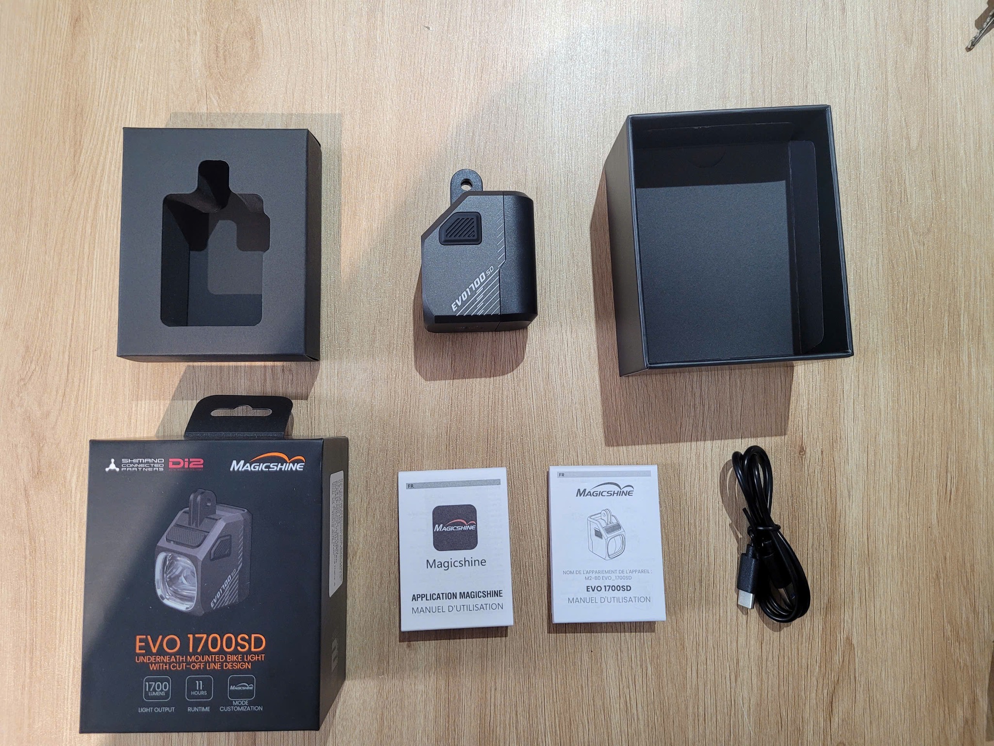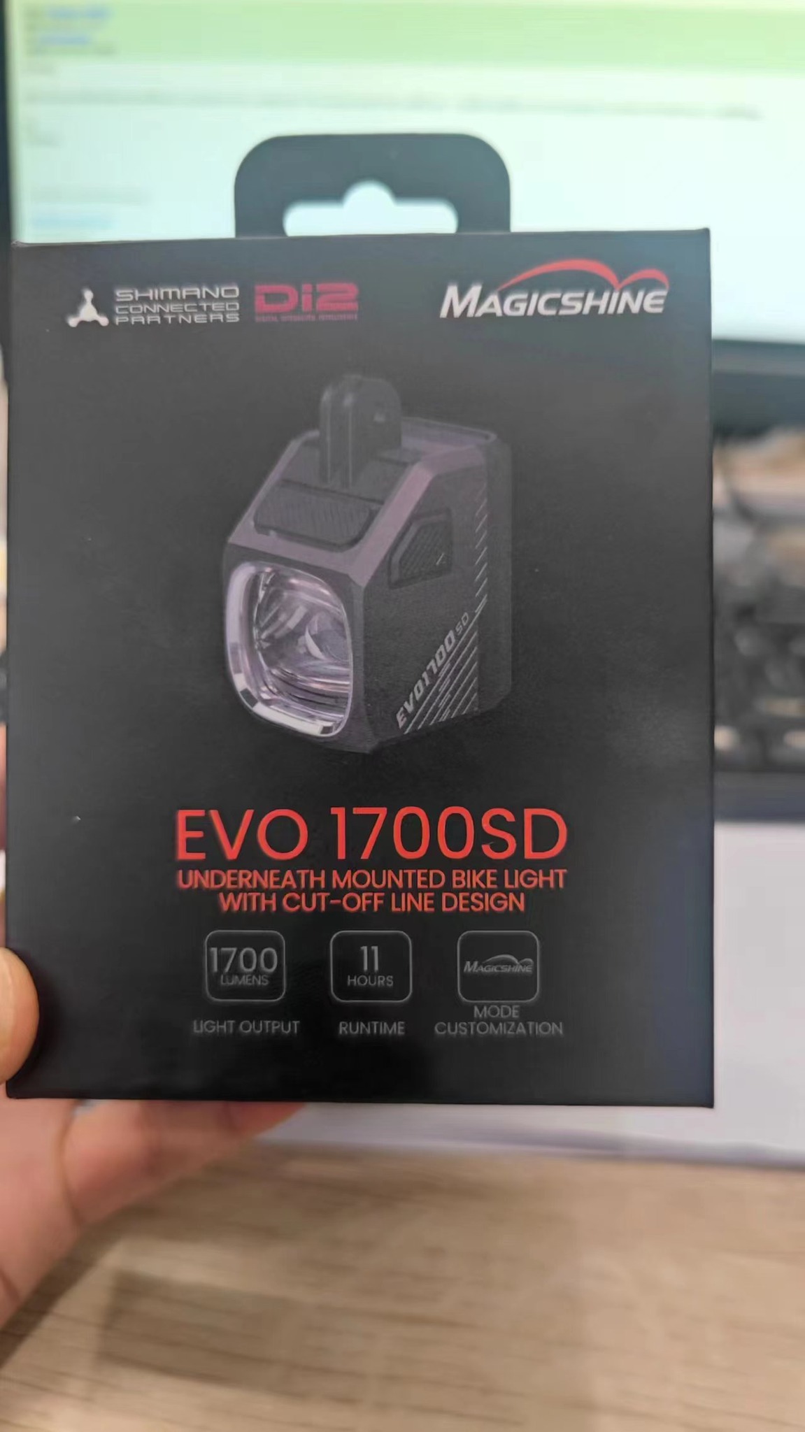Đèn xe đạp MAGICSHINE EVO 1700SD, là mẫu đèn cao cấp treo dưới. Không cần công tắc điều khiển từ xa, đèn được kết nối trực tiếp với hệ không dây SHIMANO Di2 của các bộ chuyển động SHIMANO 105, ULTEGRA và DURA-ACE. Giờ đây bạn có thể điều khiển đèn bằng nút bấm trên tay lắc Di2. Sự kết hợp này giúp tăng tính tiện dụng, chuyên nghiệp và thẩm mỹ của xe đạp, cải thiện đáng kể sự linh hoạt và an toàn.