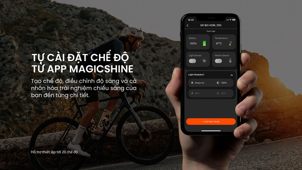 Đèn hỗ trợ kết nối với app Magicshine còn cho phép bạn tùy chỉnh độ sáng và các chế độ phù hợp với từng điều kiện đạp xe khác nhau.